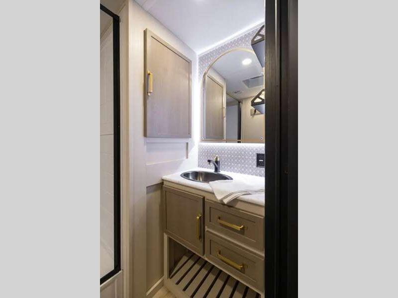 Sleeps 2 Slides 2 Length 31 ft 8 in Ext Width 8 ft Ext Height 11 ft 6 in Hitch Weight 1020 lbs Dry Weight 7563 lbs Cargo Capacity 2257 lbs Fresh Water Capacity 45 gals Grey Water Capacity 60 gals Black Water Capacity 30 gals Available Beds Custom King Refrigerator Type 12V Refrigerator Size 10 cu ft Cooktop Burners 3 Number of Awnings 1 Water Heater Type On Demand Tankless AC BTU 18000 btu TV Info 40" LED Smart TV Awning Info 22' with LED Lights Axle Count 2 Washer/Dryer Available Yes Shower Type Walk-In Shower Electrical Service 50 amp Similar Floorplans