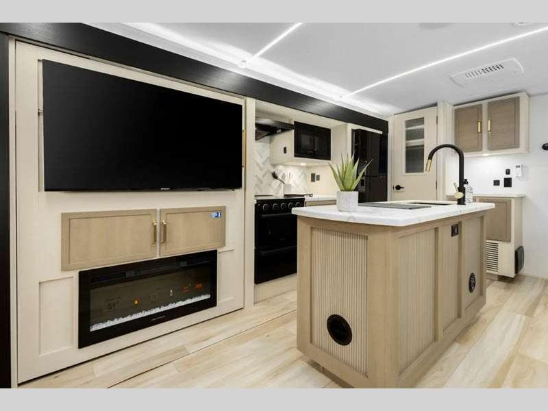 Sleeps 3 Slides 2 Length 33 ft 1 in Ext Width 8 ft Ext Height 11 ft Hitch Weight 1160 lbs Dry Weight 8243 lbs Cargo Capacity 1717 lbs Fresh Water Capacity 49 gals Grey Water Capacity 90 gals Black Water Capacity 30 gals Available Beds Custom King Refrigerator Type 12V Refrigerator Size 10 cu ft Cooktop Burners 3 Number of Awnings 1 Water Heater Type On Demand Tankless AC BTU 31500 btu TV Info LR 50" LED Smart TV Awning Info 19' with LED Lights Axle Count 2 Washer/Dryer Available Yes Shower Type Radius Electrical Service 50 amp Similar Floorplans