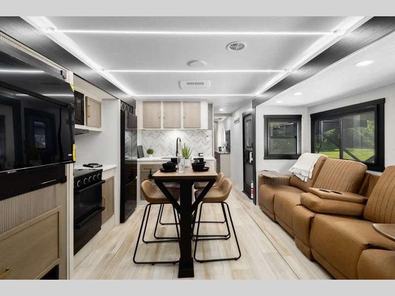 Sleeps 4 Slides 2 Length 35 ft Ext Width 8 ft Ext Height 11 ft 5 in Int Height 0 ft Hitch Weight 915 lbs Dry Weight 8433 lbs Cargo Capacity 1282 lbs Fresh Water Capacity 45 gals Grey Water Capacity 60 gals Black Water Capacity 30 gals Available Beds Queen Refrigerator Type 12V Refrigerator Size 10 cu ft Cooktop Burners 3 Number of Awnings 1 Water Heater Type On Demand Tankless AC BTU 31500 btu Cargo Deck Size 0 ft TV Info 50" LED Smart TV Awning Info With LED Lights Axle Count 2 Shower Type Standard Electrical Service 50 amp Similar Floorplans
