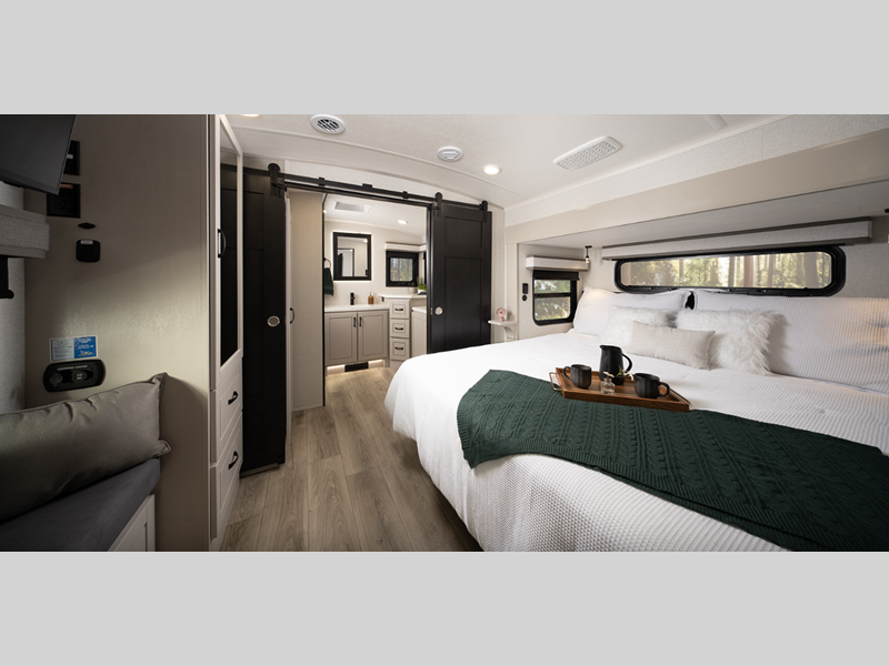 Sleeps 4 Slides 3 Length 36 ft Ext Width 8 ft 6 in Ext Height 13 ft 2 in Int Height 8 ft 6 in Interior Color Dune Gray Hitch Weight 2510 lbs GVWR 16000 lbs Dry Weight 13375 lbs Cargo Capacity 2625 lbs Fresh Water Capacity 75 gals Grey Water Capacity 87 gals Black Water Capacity 50 gals Tire Size 215/75R17.5"H Furnace BTU 40000 btu Available Beds King Refrigerator Type GE Residential Refrigerator Size 21 cu ft Cooktop Burners 4 Number of Awnings 2 LP Tank Capacity 40 lbs. Water Heater Type On Demand Tankless AC BTU 30000 btu TV Info LR 4K Smart LED HDTV, BR 32" 4K Smart TV Awning Info 10' and 16' Electric w/Integrated LED Lights Axle Count 2 Washer/Dryer Available Yes Number of LP Tanks 3 Shower Type Walk-In Shower Similar Floorplans