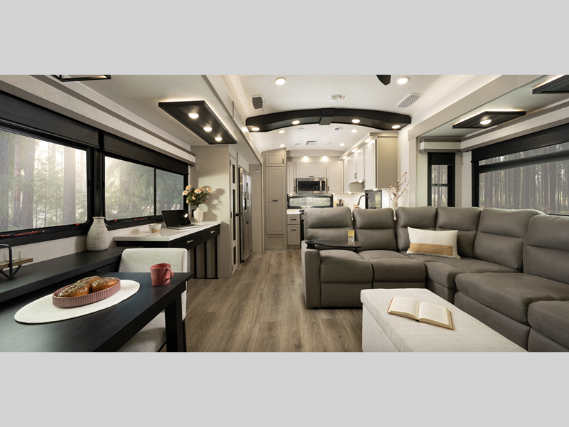 Sleeps 6 Slides 5 Length 43 ft 10 in Ext Width 8 ft 6 in Ext Height 13 ft 5 in Int Height 8 ft 6 in Interior Color Dune Gray Hitch Weight 3045 lbs GVWR 17995 lbs Dry Weight 15470 lbs Cargo Capacity 2525 lbs Fresh Water Capacity 75 gals Grey Water Capacity 82.5 gals Black Water Capacity 74 gals Tire Size 215/75R17.5"H Furnace BTU 40000 btu Available Beds King Refrigerator Type GE Residential Refrigerator Size 21 cu ft Cooktop Burners 4 Number of Awnings 2 LP Tank Capacity 40 lbs. Water Heater Type On Demand Tankless AC BTU 30000 btu TV Info LR 65" 4K Smart LED HDTV, Kitchen 40" TV, BR 32" 4K Smart TV Awning Info 12' and 19' Electric w/Integrated LED Lighting Axle Count 2 Washer/Dryer Available Yes Number of LP Tanks 3 Shower Type Walk-In Shower Similar Floorplans
