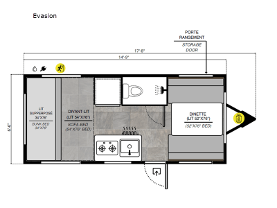 You get to skip the public facilities when you travel with this Evasion. As you enter there is a shower and toilet giving you privacy to get cleaned up. You can make a meal using the stove or microwave and dine at the dinette that becomes a 76" x 52" bed at night. You will also find sleeping space on the sofa bed in the rear with a cabinet bunk bed above, allowing five people to stay the night. Other features that allow you to stay in comfort include a fridge, a 20,000 BTU heater, and a water heater. Be sure to take a look at the options, such as adding an air conditioner, a front window with a curtain, and a radio.