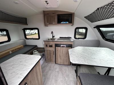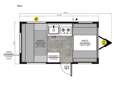 Hitch up your compact car to easily tow this popular model, the Mini. This camping caravan can easily accommodate four people with the sofa that converts into a 74" x 54" bed and the dinette offering a 74" x 48" sleeping space. You will also have the comfort of 20,000 BTU heating, a 3.7/4.2 cu. ft. refrigerator, and a stove.  Outside you will find a 120-volt outlet and a storage door for a few more items. You may decide to add a option or two such as an air conditioner, solar panels, or a radio!