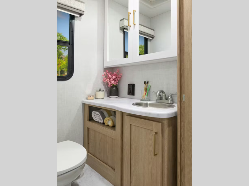 A Ford E-Series chassis or optional Chevy chassis on select models will get you to your destination with ease. There is also a touchscreen dash radio and a back-up monitor to easily park once you're there. You'll appreciate the lighted rotocast storage compartments with lights outside, along with a power awning with LED lights and drop down stairwell entrance step with an accent light. Inside, you'll feel right at home with residential vinyl flooring, premium window privacy shades, and pressed laminate countertops throughout!
