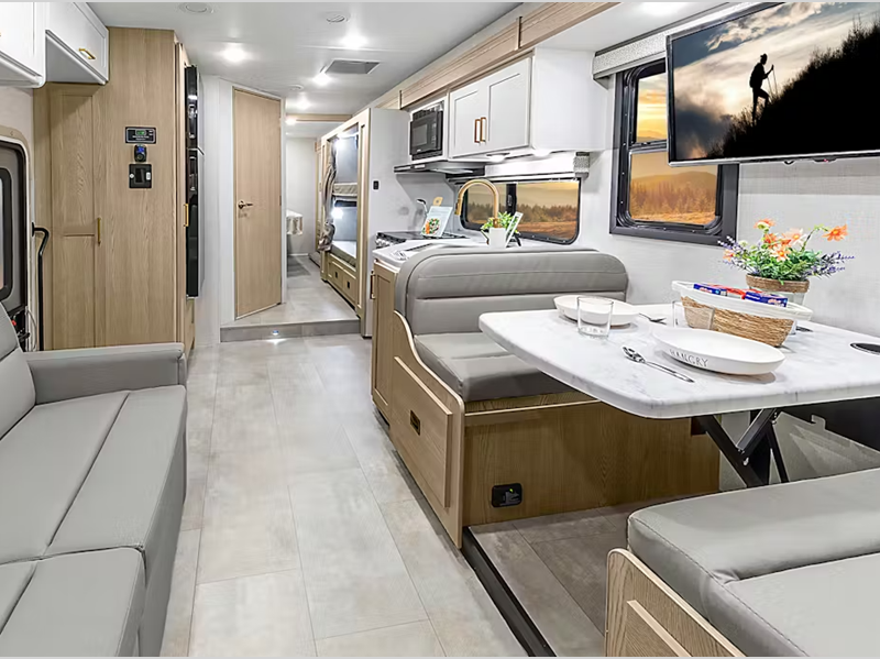 Sleeps 8 Slides 1 Length 32 ft 8 in Ext Width 8 ft 3 in Ext Height 11 ft 2 in Int Height 7 ft Interior Color Aspen Gray, Snow Leopard Exterior Color Standard Graphics, Standard Graphics with Partial Paint Hitch Weight 8000 lbs GVWR 14500 lbs Fresh Water Capacity 40 gals Grey Water Capacity 28 gals Black Water Capacity 28 gals Furnace BTU 30000 btu Generator 4.0 kW Gas Fuel Type Gasoline Engine 7.3L V8 Chassis Ford E-Series Horsepower 325 hp Fuel Capacity 55 gals Wheelbase 223 in Number Of Bunks 3 Available Beds RV Queen Torque 450 ft-lb Refrigerator Type 12V with Auto Generator Start Cooktop Burners 3 Shower Size 32" x 32" Number of Awnings 1 LP Tank Capacity 40 lbs Water Heater Type Tankless AC BTU 15000 btu Basement Storage 55.7 cu. ft. TV Info LR 40" Smart TV Awning Info 16' Power w/Integrated LED Lighting Gross Combined Weight 22000 lbs Shower Type Radius Electrical Service 30 amp Similar Floorplans