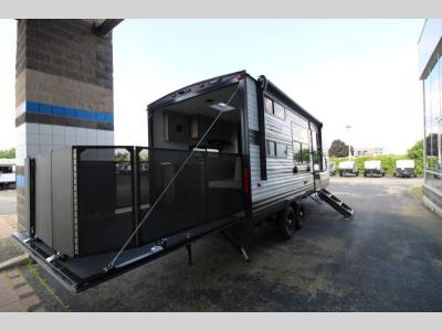 The 3-Season Door: Keystone’s rear ramp patio systems are refined over generations. Their "Fast Track" patio system (standard on many models) sets up in seconds without loose pins or heavy rails to lift, making your deck usable instantly.